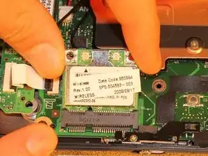 Найдите чёрную и белую защёлку, которая соединяет шлейф тачпада с материнской платой.