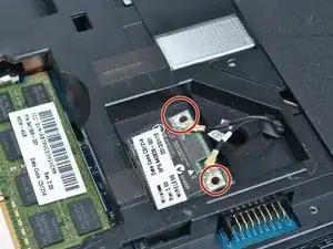 Удалите два винта, расположенные в углах беспроводной карты, с помощью отвертки Phillips #000.