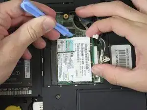 Используйте пластиковый инструмент для поддевания, чтобы отжать защёлки по бокам беспроводной карты. Эти защёлки фиксируют карту на месте.