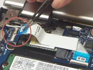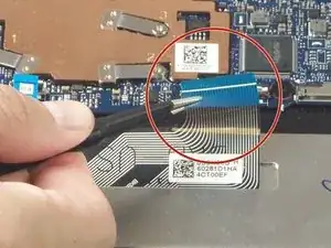 Используйте пинцет, чтобы отключить со стороны материнской платы ленточный кабель трекпада. Аккуратно поднимите чёрную защёлку — кабель выйдет из ZIF-разъёма.