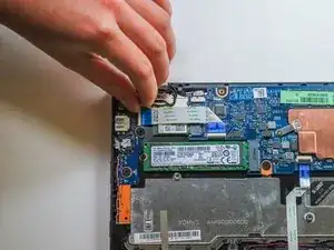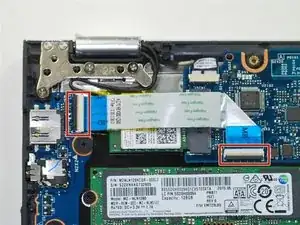 Отключите оба конца двух голубых ZIF (нулевого усилия вставки) разъемов в верхнем левом углу, аккуратно поднимая черные зажимы на разъеме и тянув вверх и в стороны от обоих концов разъемов.