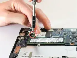 Удалите два винта Phillips #1 по 3 мм, удерживающих батарею на шасси ноутбука.