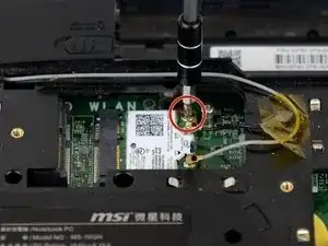 С помощью крестовой отвертки Phillips #00 отвинтите один винт 2 мм, который удерживает беспроводную карту на месте.