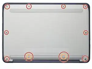 Удалите винты Phillips #1 с нижней части Chromebook с помощью отвертки Phillips #1.
