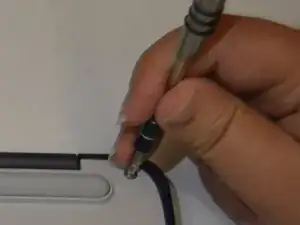 Используйте пинцет, чтобы достать два винта, скрытые резиновыми заглушками вдоль резиновой подставки устройства.