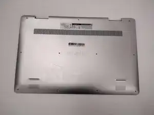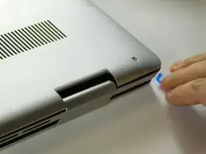 Осторожно подденьте крышку основания с помощью инструмента для открытия iFixit в щели рядом с петлями. Ведите поддеватель вдоль краев и слегка поднимайте его вверх по мере продвижения.