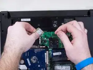После удаления винтов к карте будут прикреплены 2 провода. Их можно легко отсоединить вручную, чтобы полностью отключить карту от ноутбука.