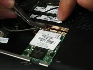 Используйте пару пинцетов, чтобы отсоединить обе антенны от их разъемов на беспроводной карте.