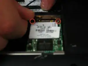Удалите два винта Phillips длиной 3.7 мм, крепящих беспроводную карту к материнской плате.