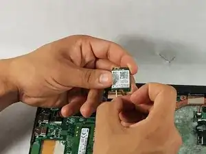 Извлеките беспроводную карту из компьютера, аккуратно потянув её в направлении дальней длинной стороны корпуса под углом вверх.