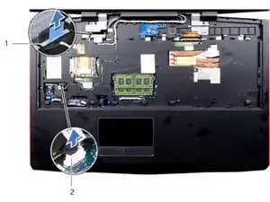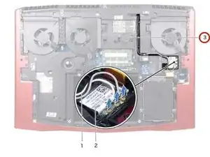 Запомните путь прокладки кабеля дисплея и кабеля платы светодиодной подсветки логотипа, затем извлеките кабели из направляющих на панели с основными клавишами.