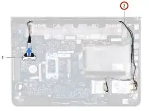 Запомните путь прокладки кабелей и аккуратно извлеките кабели антенны модуля Mini-Card из направляющих.