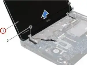 Выкрутите два винта (по одному с каждой стороны), которые крепят блок дисплея к корпусу компьютера.