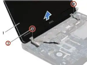 Установите НОВЫЙ блок дисплея на место и установите на место два винта (по одному с каждой стороны), которые крепят блок дисплея к корпусу компьютера.
