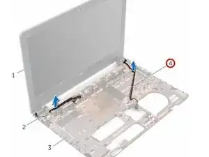 Обратите внимание на прокладку антенных кабелей и снимите антенные кабели с направляющих на основании компьютера.