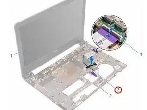Обратите внимание на прокладку кабеля дисплея и снимите кабель с направляющих на основании компьютера.