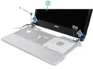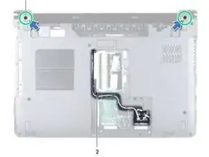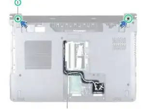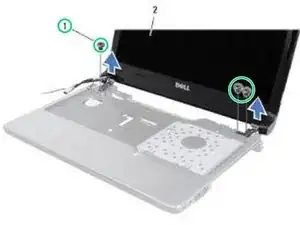 Снимите два винта на нижней части компьютера, которые закрепляют блок дисплея на основании компьютера.
