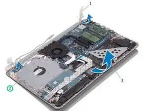 Установите винты, которые крепят петли дисплея к подставке для кистей и узлу клавиатуры.
