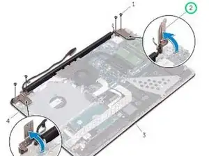 Уберите винты, которые крепят петли дисплея к подставке для кистей и корпусу клавиатуры.