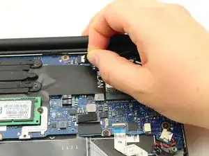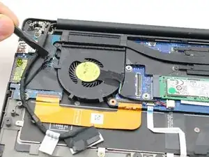 Аккуратно отсоедините слайдерный разъём кабеля от его гнезда слева от вентилятора.