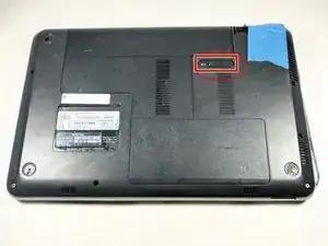 Переверните ноутбук нижней частью вверх. Подденьте две задние резиновые ножки маленькой плоской отверткой и снимите два одинаковых винта Philips под ними.