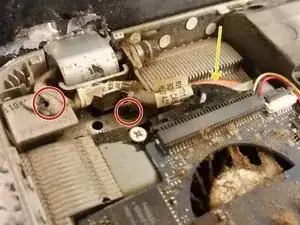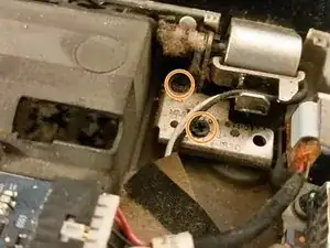 Удалите два меньших винта Philips, крепящих левый шарнир к основанию.
