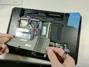 Извлеките жесткий диск, потянув за язычок корзины, отсоедините разъём на материнской плате и отложите диск в сторону. Удалите все винты, видимые сзади в месте установки жесткого диска. Также отсоедините разъёмы антенн беспроводной сети.