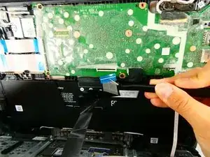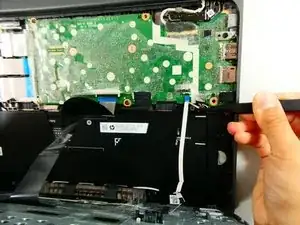 Поднимите фиксатор и пинцетом отсоедините ленточный кабель тачпада.