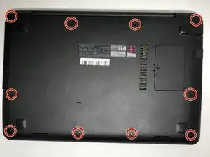 Используйте крестовую отвёртку Phillips #0, чтобы выкрутить десять винтов 18 мм Phillips #0 на нижней панели ноутбука.