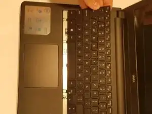 Поднимите клавиатуру с корпуса. *Будьте осторожны, чтобы не оборвать шлейф, который соединяет заднюю часть клавиатуры с корпусом при подъёме.*