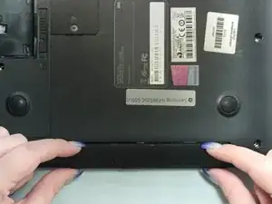 Удерживая левый и правый переключатели в положении разблокировки, вытяните батарею из компьютера.