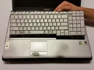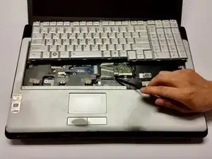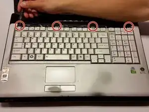 Для этой замены необходимо снять клавиатуру, чтобы получить доступ к CD-приводу. Шаги по снятию клавиатуры приведены в руководстве с требованиями вверху страницы. После снятия клавиатуры можно переходить к извлечению CD-привода.