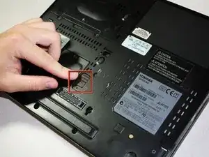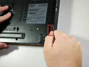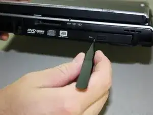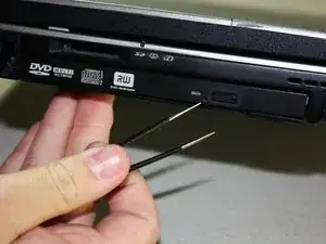Найдите CD-привод на правой стороне ноутбука Toshiba Portege M400 и обнаружьте маленькое отверстие рядом с кнопкой CD-привода.