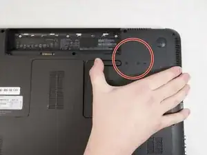 Переверните ноутбук и сдвиньте защелку вправо (или в ту сторону, на которую указывает символ).