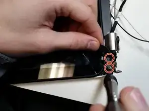 Поднимите и выведите провода из каналов до петлей шарниров экрана.