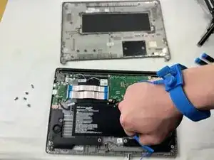 Используйте инструмент для вскрытия iFixit, чтобы приподнять нижнюю панель и отсоединить её от остальной части Chromebook.
