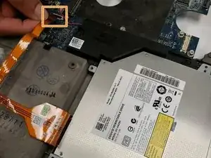 Тонкая часть оранжевого разъёма должна быть отключена от материнской платы. Оптический привод при этом всё ещё может быть прикреплён к одному концу разъёма.