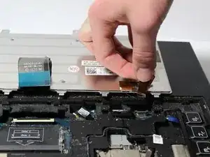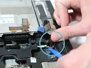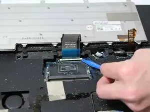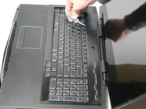 Используйте пластиковый рычажный инструмент, чтобы ослабить плоскую панель вокруг клавиш, аккуратно поддев её вверх от основания ноутбука.