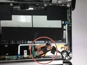 Отключите кабель DC разъема и кабель батареи от материнской платы с помощью пинцета, острого конца пластикового инструмента или просто потянув кабели от материнской платы пальцами.
