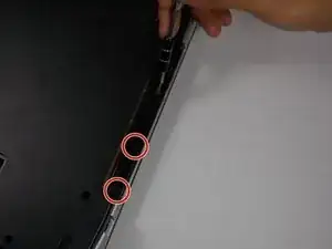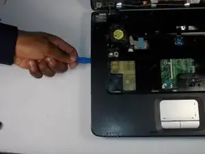 Проведение инструмента вдоль кромки верхней панели освободит защёлки, удерживающие верхнюю и нижнюю панели вместе, что позволит получить доступ внутрь ноутбука.