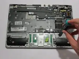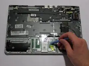 Поднимите фиксатор ленточного кабеля тачпада с помощью пластикового инструмента для вскрытия.