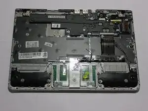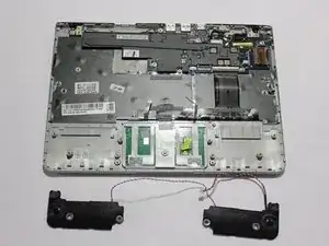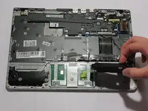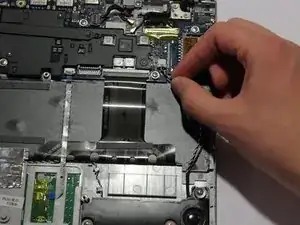 Поднимите ленточный кабель тачпада, чтобы он не мешал проводке динамика.