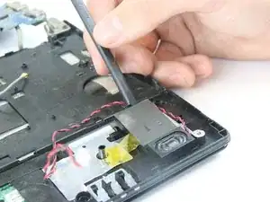С помощью лопатки приподнимите динамик и вытащите его из держателя, как показано. Жёлтая пластмассовая лента должна отслоиться вместе с ним.