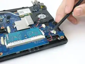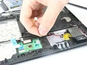 С помощью лопатки отсоедините от разъёма красно‑чёрный кабель, расположенный над динамиком.