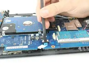 Также лопаткой отсоедините небольшой ленточный кабель, расположенный в нижней части материнской платы ближе к середине.