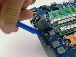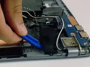 Используя пластиковую лопатку, подденьте левый динамик и извлеките его.