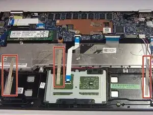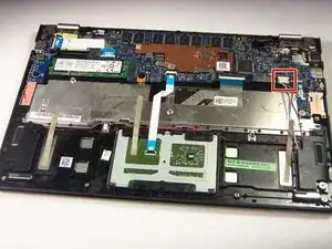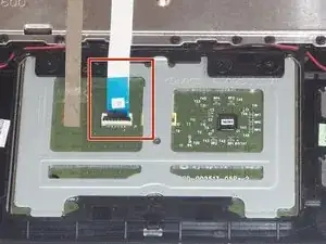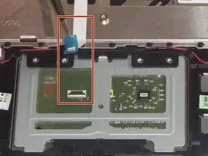 С помощью пинцета отсоедините ZIF-коннектор, фиксирующий шлейф тачпада. Аккуратно поднимите черную защелку, и кабель освободится.