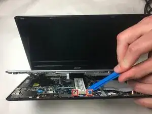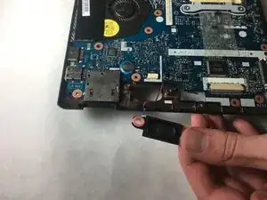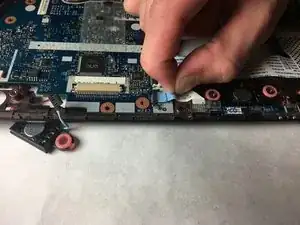 С помощью монтажной лопатки аккуратно выньте разъём, соединяющий левый динамик с материнской платой.