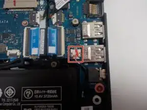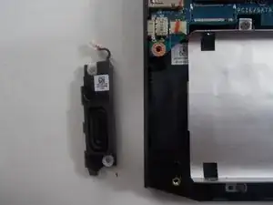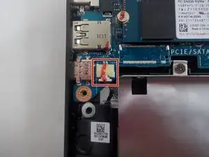 Найдите два разъёма динамиков на материнской плате. Используйте инструмент для вскрытия iFixit, чтобы аккуратно поддеть каждый разъём прямо вверх из гнезда. Внимание: возможен риск повреждения устройства. Не тяните за провода динамиков, прикладывайте давление только к пластиковым разъёмам.