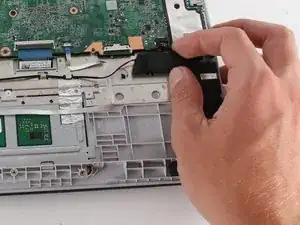 Используя маленький пластиковый инструмент для вскрытия, подденьте левый динамик и извлеките его из корпуса Chromebook.